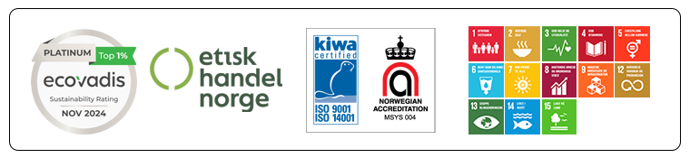 Artisti er ISO-sertifisert i Ledelsessystem for kvalitet (NS-EN ISO 9001:2015) og Ledelsessystem for miljø (NS-EN ISO 14001:2015). Vi har Platinum-sertifisering hos EcoVadis på vårt bærekraftsarbeid og vi er medlem av Etisk Handel Norge. Gjennom våre ISO-sertifiseringer dekker vi 12 av 17 bærekraftsmål.